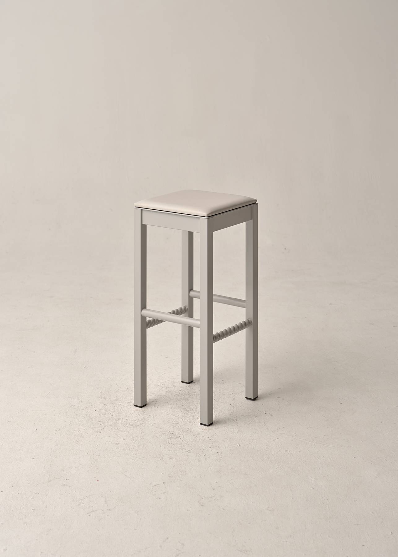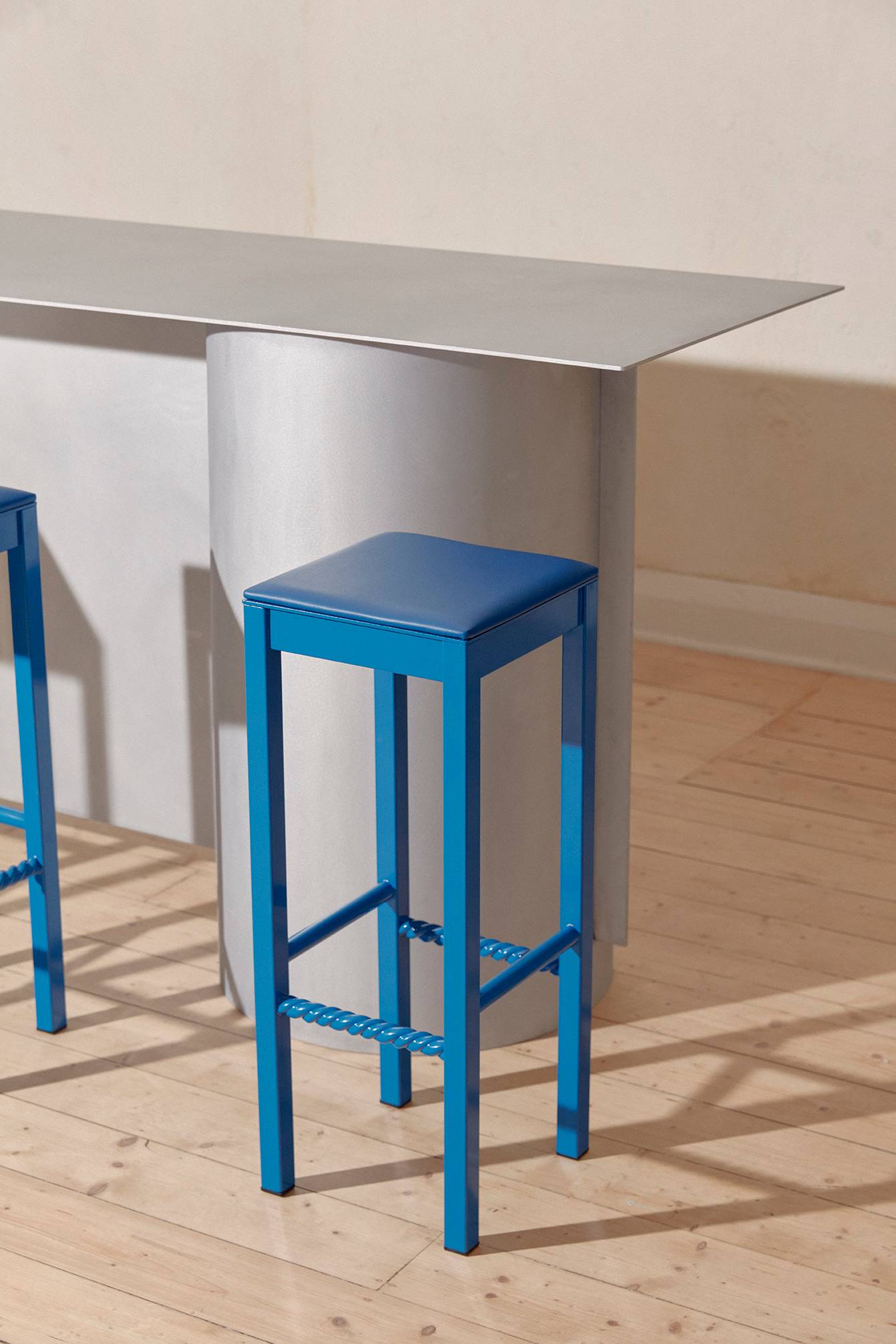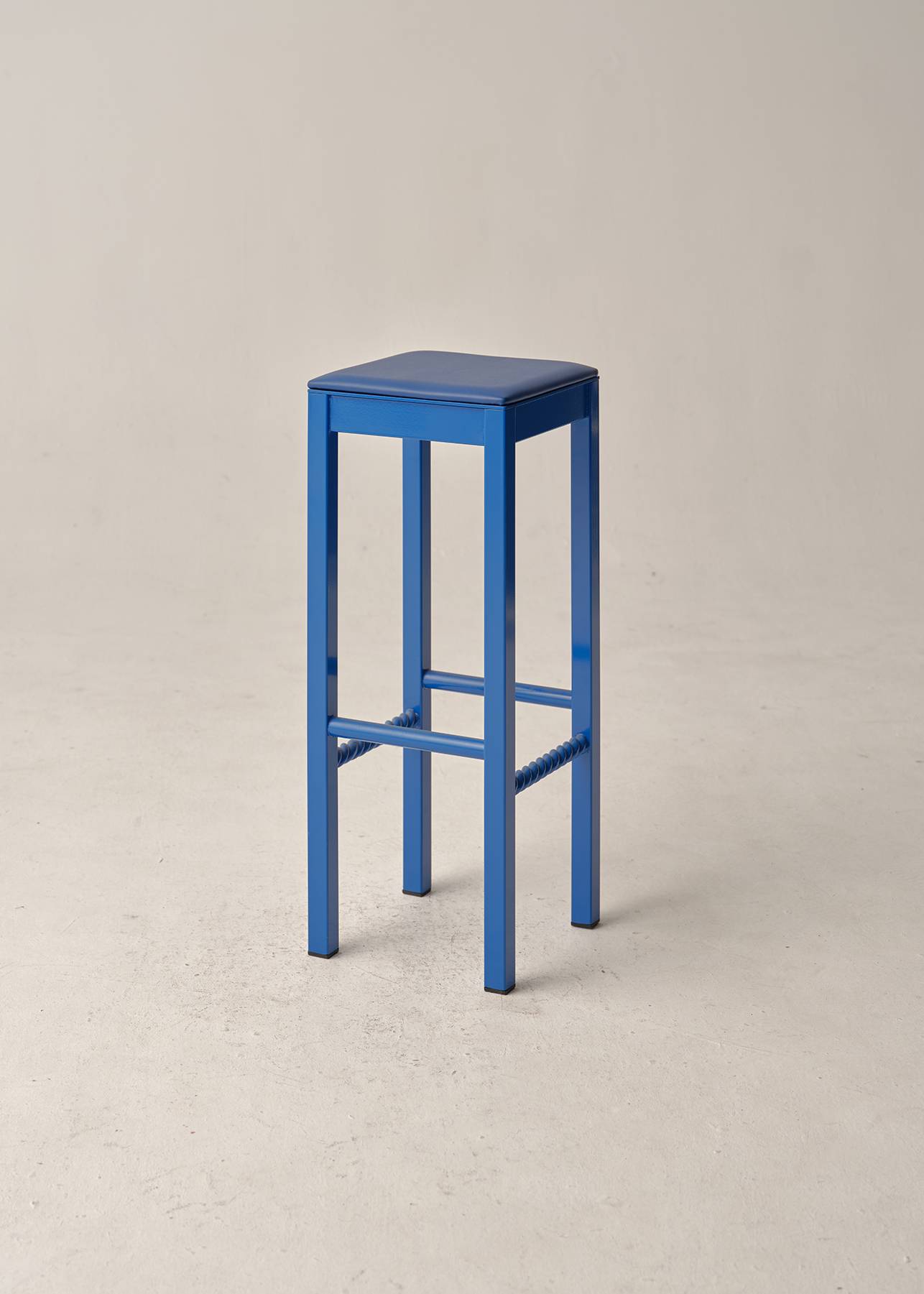 Chubby Counterstool and Barstool explores the standardisation of steel. This range is an interpretation of traditional wooden furniture, fabricated from different steel extrusions and components. Upholstery in matching Vinyl. Other fabrics available upon request.